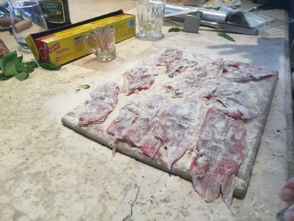 On each scaloppini add a pinch of salt ( little) , black pepper, the sage leave and on the top the prosciutto slice. With a toothpick fix the meat with the sage and the prosciutto. Put flour on each side. Put the butter in a pan and heat, once the butter is melted put the saltimbocca in the pan and cook first on the side without the ham, once “golden” turn on the other side for 1,2, minutes. Sprinkle with the white wine and cook for 1 and a half minutes more.