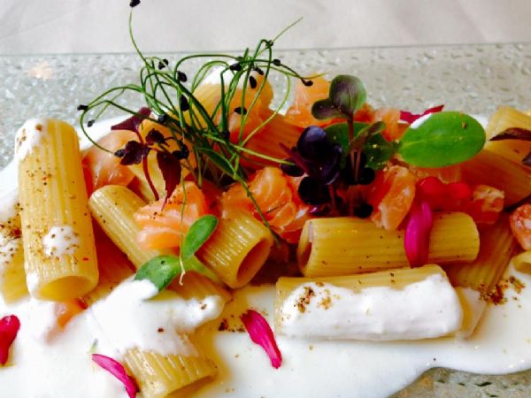 Rigatoni pasta with smoked salmon and buffalo milk