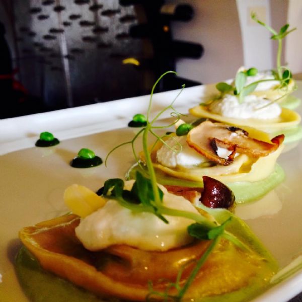 Heat the blended mushroom with some creamy goat cheese, adjust with salt and some of the boiling water for the right consistency. Put this cream on the bottom of the plate and the ravioli on the top. Sprinkle with some very fine minced parsley.